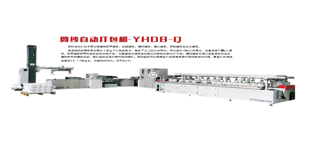 日照裕華機械YHDB-Q筒紗自動打包機系統(tǒng)主要包括配重模塊、包膜模塊、自動上袋模塊、手/自動縫包模塊、捆扎模塊及碼垛等模塊構(gòu)成,通過該系統(tǒng)很好的實現(xiàn)了對筒紗編織袋的自動打包過程;為適用客戶需求,相繼開發(fā)了靜態(tài)噴碼機、視覺檢測、快速包膜機、繞膜包裝、立體式單通道配重機及自動上紗機等設(shè)備。